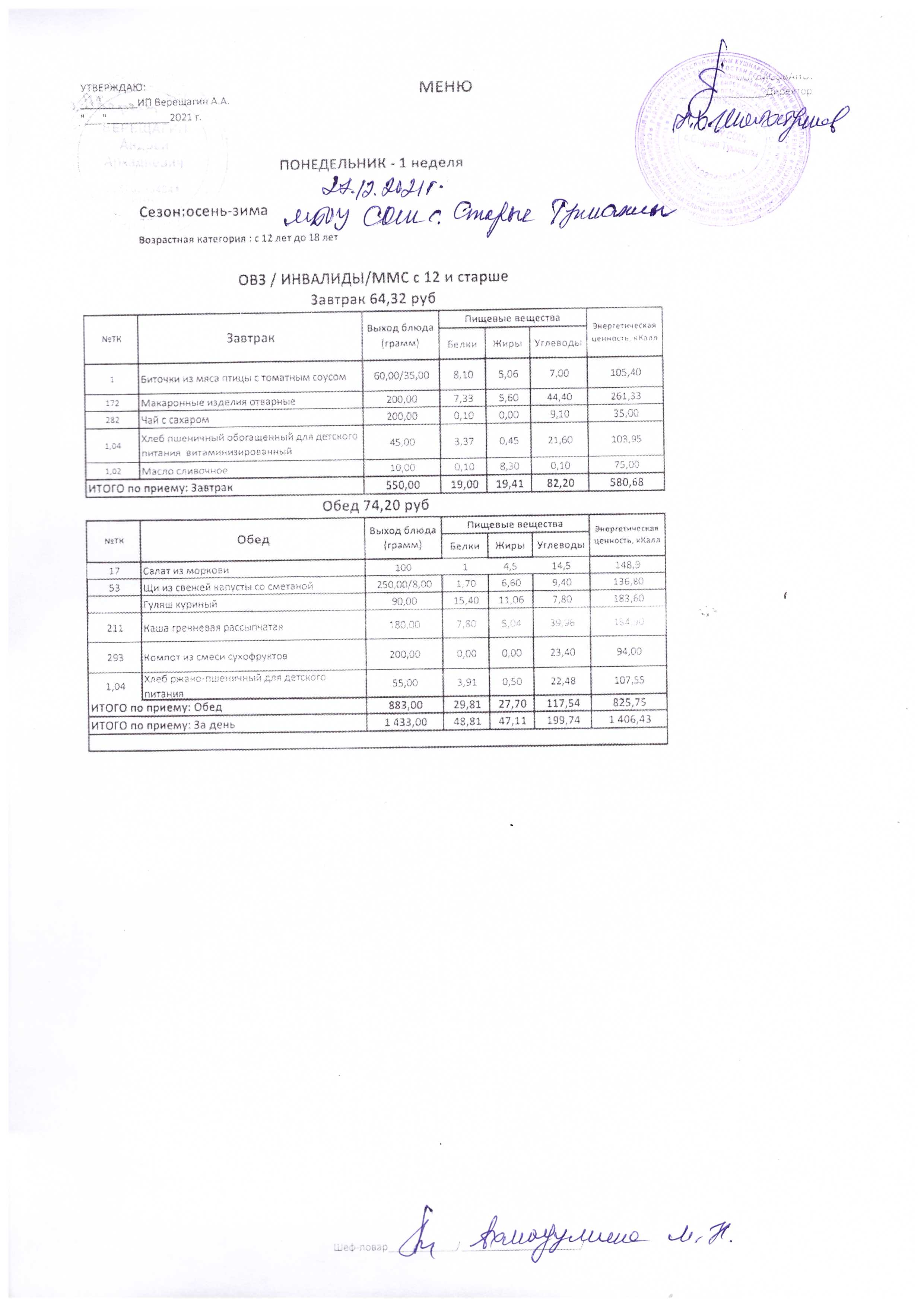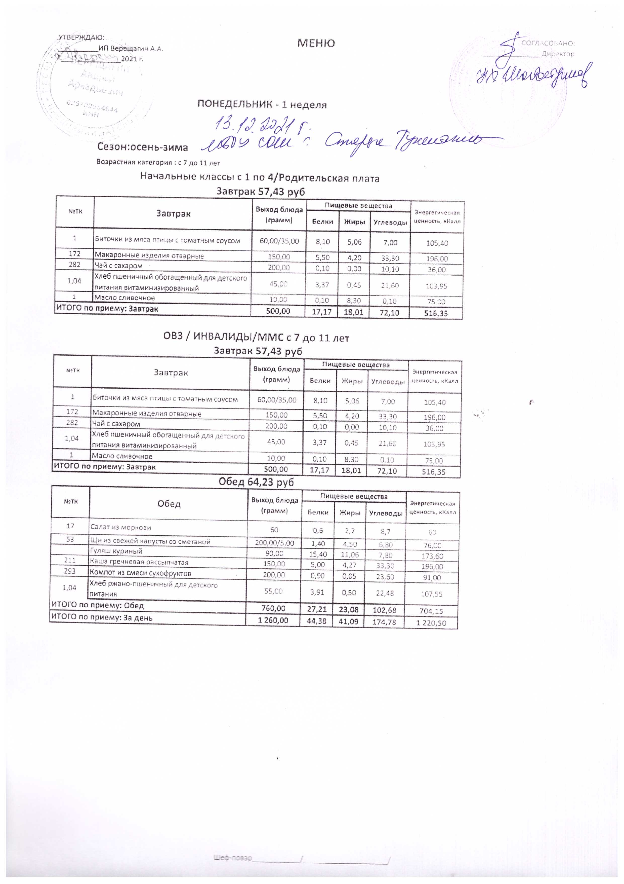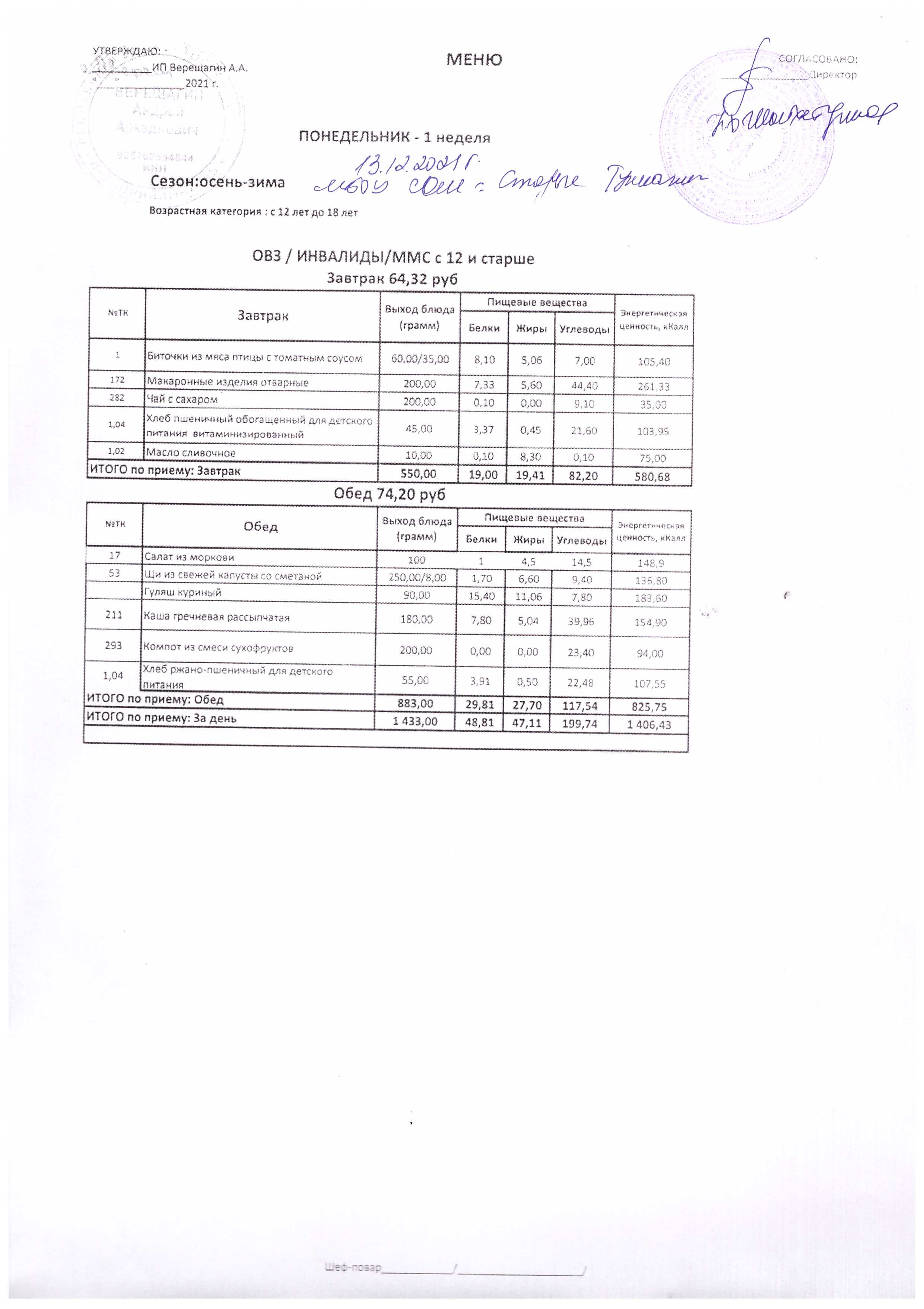 (Меню на 13.12.2021 г.)