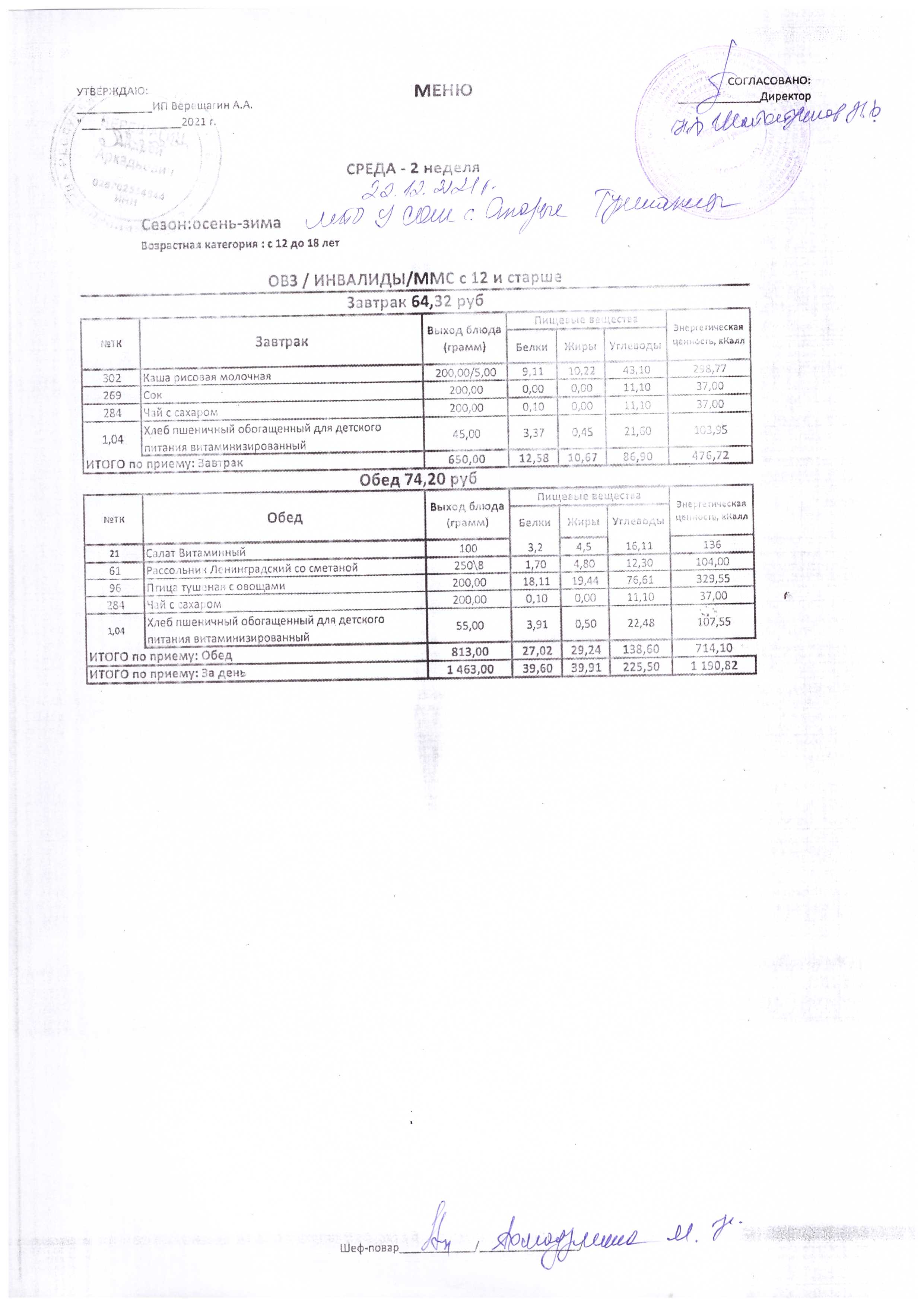 (Меню на 22.12.2021 г.)
